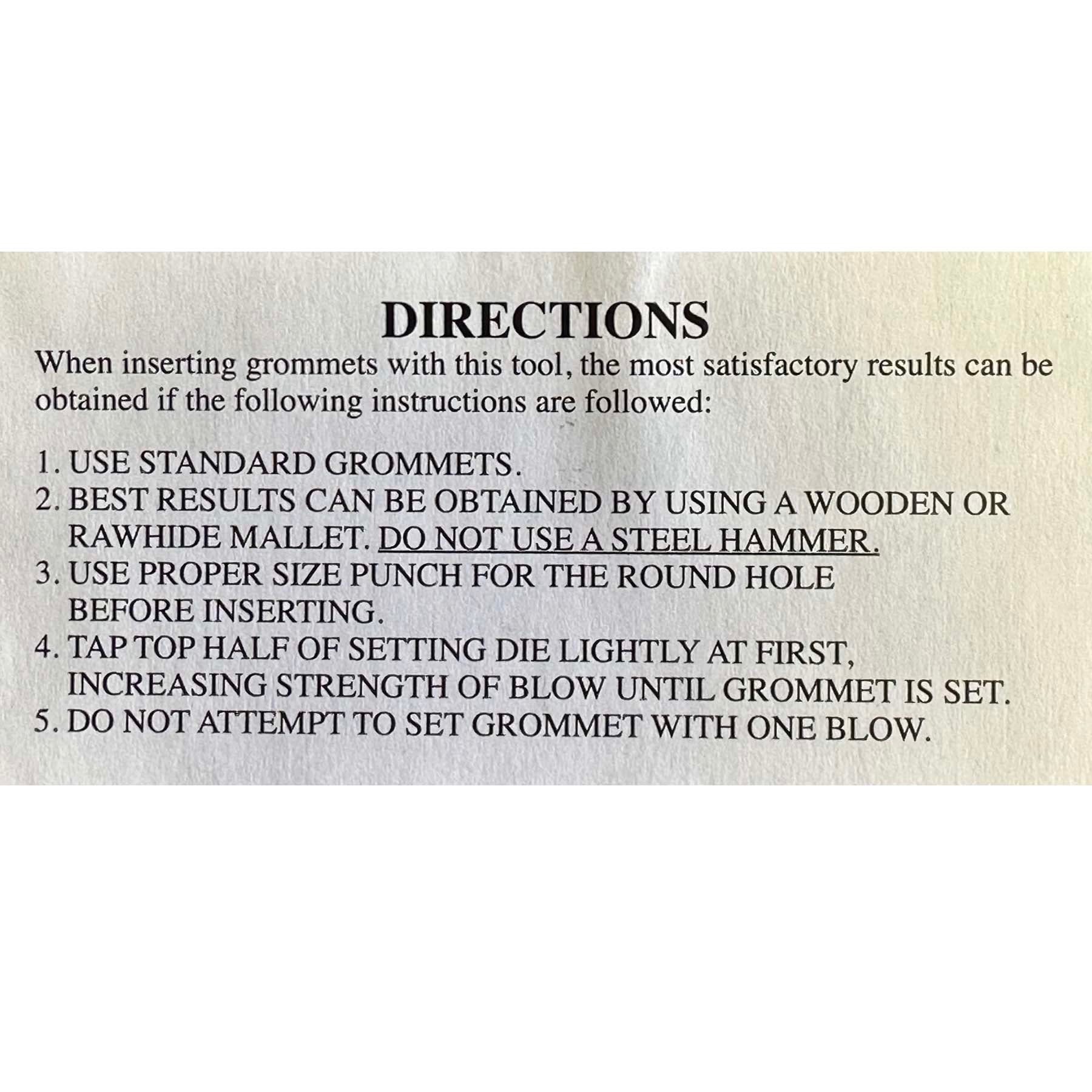 Manufactured on sophisticated CNC machines that produce high precision parts that properly mate the grommet & washer every time. Most importantly, the Stainless Grommet Setting Dies are engineered from a high carbon steel tough enough to set stainless steel grommets. Available in 6 sizes. Plain grommet setting dies and grommet hole cutters should be used with an rawhide hammer or wooden mallet, or rubber mallet, not with a steel hammer. Designed for plain grommets and washers.